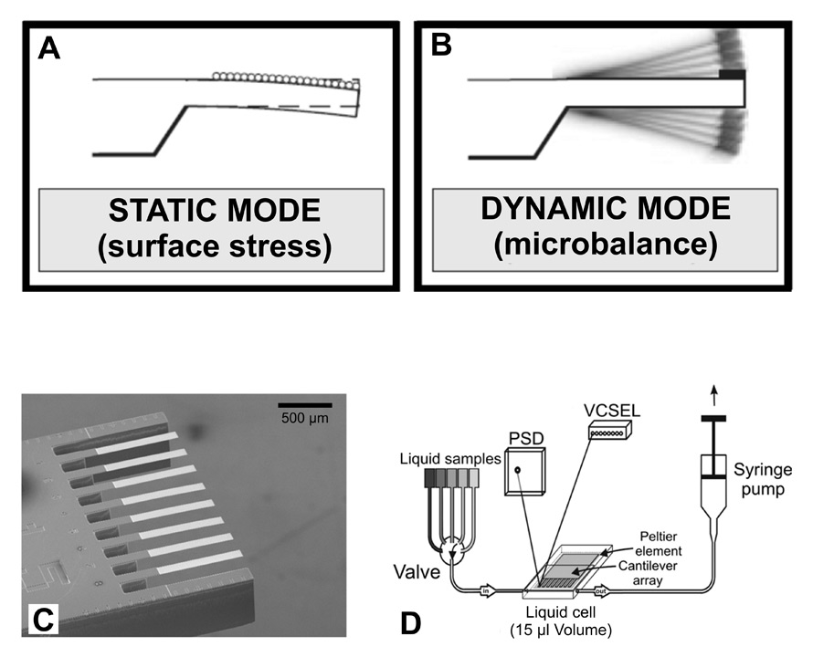 Two frequently used modes of cantilever sensor operation. The first one (A) shows the static mode where surface stress results in cantilever bending. The second mode (B) shows the operation in dynamic mode. Here the cantilever is actuated and vibrates at its specific resonance frequency. Upon binding of a ligand to the surface the resonance frequency changes and the adsorbed mass can be calculated from that shift. The two modes can also be used simultaneously. (C) Shows an electron microscope image of an array with eight 750 µm long cantilevers. (D) Illustrates the liquid handling system and the beam deflection read out of a cantilever setup. A total of 8 Vertical Cavity Surface Emitting Lasers (VCSEL) are used to sequentially determine cantilever deflections. The laser beam is deflected at the end of the cantilevers to a Position Sensitive Detector (PSD). Below the cantilever array is a peltier element which produces a heat pulse to test the mechanical properties of the cantilevers. Syringe pump and multi valve systems allow a constant flow of samples to the cantilever measurement chamber.