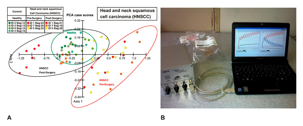 (A) Principal Component Analysis plot showing three distinct clusters (indicated with ellipses) that represent healthy control persons, head and neck squamous cell carcinoma (HNSCC) patients before surgery and HNSCC patients after surgery, i.e. after removal of the tumour by surgery. The points of the HNSCC patients after surgery are at a similar location in the PCA plot as those from the healthy persons and differ clearly from the points of the HNSCC patients before surgery, indicating that the removal of the tumour has been successful.(B) Portable USB-powered setup for mobile characterisation of patients' breath samples using polymer-coated membrane surface stress sensors. From left to right: Measurement system containing chamber with piezo membrane sensor array and pumps for aspiration of sample; breath sample bags; netbook with operating and analysis software.