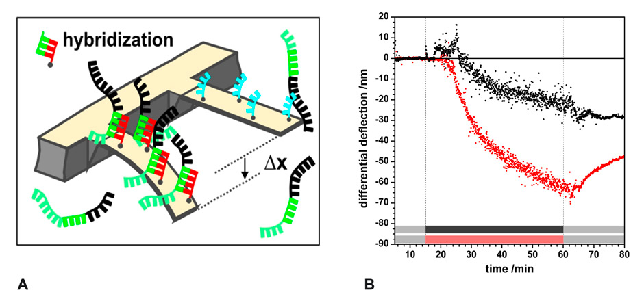 (A)The example of DNA hybridisation to immobilised oligonucleotides illustrates the molecular crowding, which creates a surface stress resulting in cantilever bending. A differential deflection (Δx) can be measured with the help of a reference cantilever. (B) Measurement of total RNA from a BRAF mutated melanoma cell line (red) and from a cell line (black) that does not contain the BRAF mutation. Injection is indicated with a red and black bar at the bottom of the graph. The measurement device is washed with buffer before and after injection. The two cell lines can be clearly distinguished.