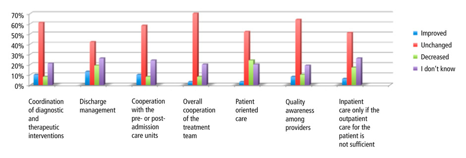 Overall, efficiency was considered to be rather good by the majority of respondents. At the same time, respondents noted little improvement with DRGs; most considered the status quo unchanged. For some items – discharge management, cooperation of the treatment team, patient-oriented care, and hospital admission only for patients who could not be treated adequately in an outpatient clinic – the majority considered the situation unchanged or didn’t know and those who considered the situation worse under DRGs exceeded the number of those who saw an improvement.