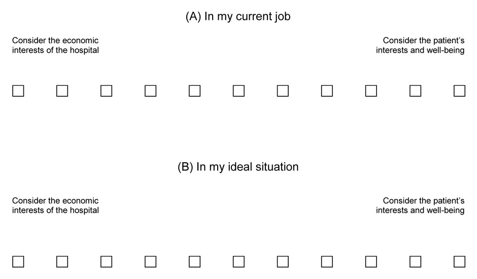 To investigate the tension between two professional principles we asked the physicians to quantify the following two considerations in their everyday clinical decision-making (fig. 2): Striving to achieve the best possible medical outcome for their patients versus considering the economic interests of their department. We asked study participants to assign a value to both principles on an 11–point Likert scale (A) for their current job and (B) for their personal ideal situation. Mean value of the answers related to the current job was 5.5 (SD 2.4); slightly over the balance point of 5, meaning they gave economic considerations and their patients’ interests equal weight, with a small bias towards their patients’ interests. Mean value of the answers related to the ideal situation was 7.7 (SD 1.8) and therefore tended more towards patient interests.
