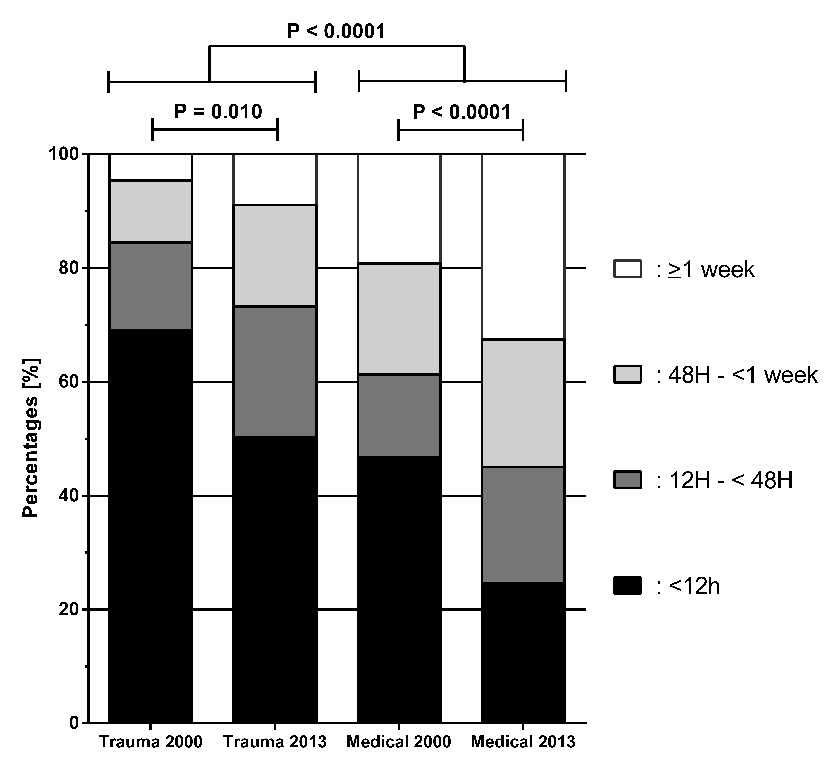 In general, the delay before the index ED visit increased significantly (p <0.001): the percentage of patients who consulted within 12 hours of their perceived symptoms dropped from 54.5% to 30.9% while those waiting more than a week increased from 14.3% to 26.9% (fig. 1). Medical patients waited longer than trauma patients in both study periods (p <0.001) (fig. 1), and the time delay for both increased significantly.