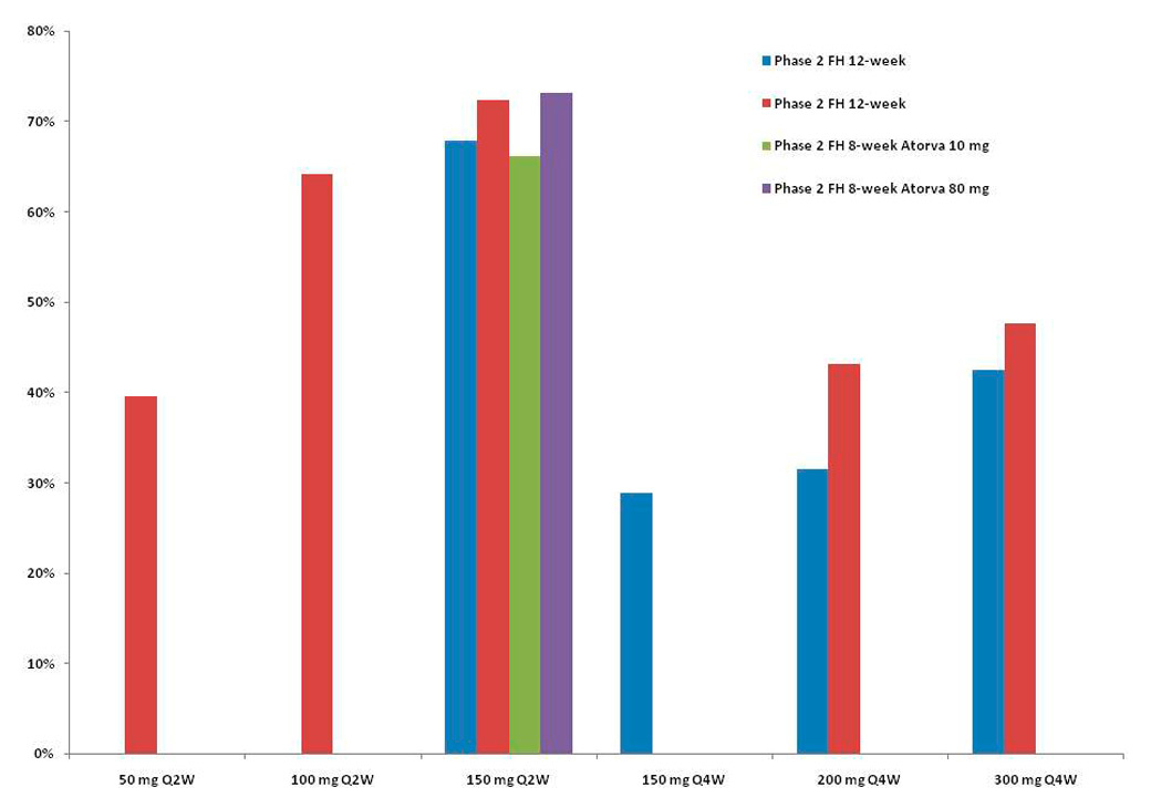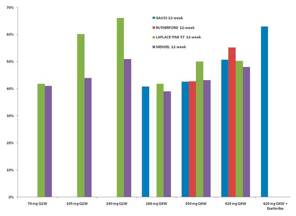In the LAPLACE-TIMI 57 phase II trial, 631 patients with hypercholesterolaemia on statins were tested to different regimen of AMG dosages with varying intervals of administration: AMG 145 70 mg, 105 mg, and 140 mg or matching placebo every two weeks; or AMG 145 280 mg, 350 mg, and 420 mg and matching placebo every four weeks. At week 12, the mean LDL-C concentration reduction was dose-dependent, and ranging from 41.8% to 66.1% every two weeks, and from 41.8% to 50.3% every four weeks [19].