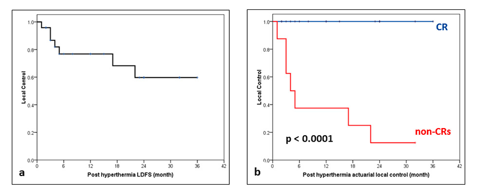 (a) Actuarial local control for all patients of recurrent breast cancers following reirradiation and hyperthermia. (b) Actuarial local control in complete responders (CRs) vs non-CRs (p <0.001).