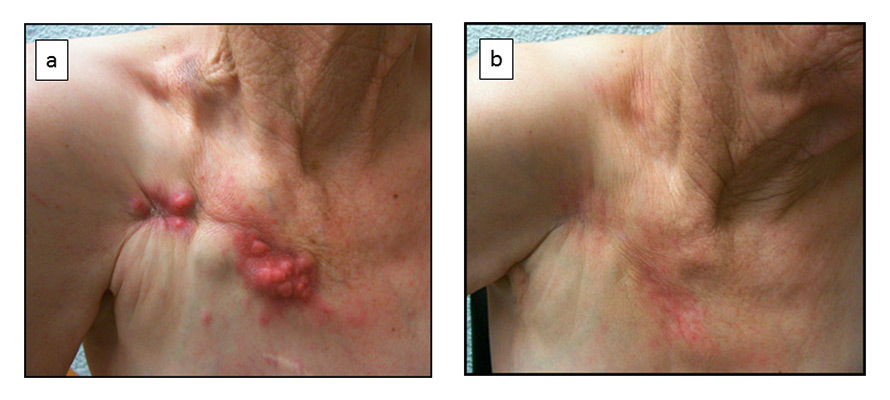 (a) Patient with isolated chest wall recurrence. (b) Complete locoregional response was achieved and sustained after reirradiation and hyperthermia at 2 years after the treatment.