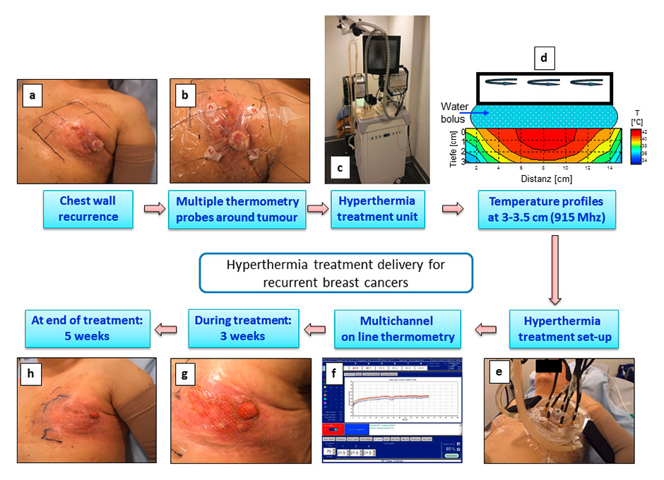 Steps involved in the hyperthermia treatment delivery for a patient with locoregional recurrent breast cancers. (a) Patient with the chest wall recurrence following previous radiotherapy. (b) Placement of multiple thermometry sensors all around the tumour in the area to be treated with hyperthermia. (c) Superficial hyperthermia treatment unit (BSD 500, 915 MHz). (d) Temperature profiles in a phantom showing the heating patterns with 915 MHz radiofrequency applicators. A water bolus has been sandwiched between the applicators and the phantoms to simulate the treatment conditions. A temperature ranging from 40–43 °C could be achieved to a depth of 3 cm. (e) and (f) Actual treatment setup with online recording of the temperature profiles. (g) and (h) Tumour regression observed at 3 weeks and at completion of treatment with minimal skin morbidity. The patient went on to achieve a complete response at 6 weeks of completion of reirradiation and hyperthermia.