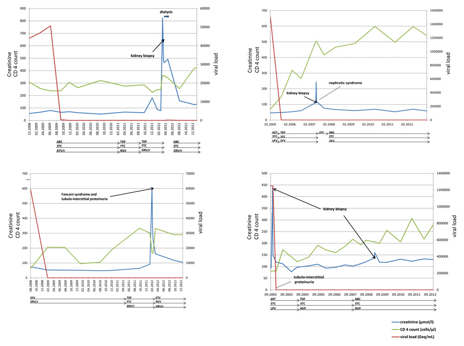 Miliary tuberculosis was the cause of AKI in patient number 10. It completely resolved with antimycobacterial therapy. Seven years later, kidney function declined again owing to hypertensive nephropathy. In patient 11 peritoneal dialysis because had to be started because of HIV-associated focal segmental glomerulosclerosis. Eventually, the patient received a cadaveric kidney transplant. TDF remained part of his antiviral therapy owing to a multiresistant HIV-strain. Patient number 12 demonstrates AKI with underlying chronic kidney failure due to interstitial nephritis of unknown origin. The association with TDF exposure is uncertain. There is a correlation between the drug exposure and worsening of kidney function, and biopsy results were compatible with interstitial nephritis. Biopsy results of patient 13 showed chronic interstitial nephritis and tubular atrophy. The cause of the chronic kidney failure is not understood. This patient now is on chronic dialysis.