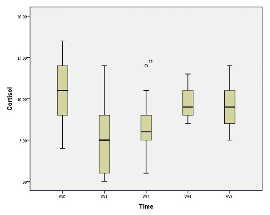 Box plot showing distribution of serum cortisol levels at each time point, where the lower and upper borders of the box and the line inside it represent quartile 1 (Q1), Q3 and the median values, and the upper and lower whiskers represent Q3+ 1.5 interquartile range (IQR) and Q1-1.5 IQR, respectively.