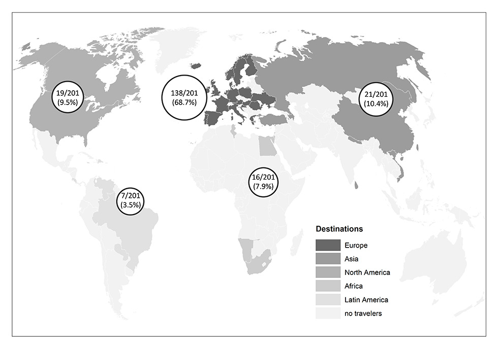 A total of 118/153 (77.1%) reported travel activity, including 201 episodes, mostly for vacation (176/201, 87.6%). Only 15 (7.5%) travel episodes were reported for business purposes. Forty-two percent of the travellers (50/118) declared multiple trips within 1 year prior to the survey. The median reported number of travel episodes was 1 (interquartile range [IQR] 1–2). Most travel episodes were in company (148/201, 73.6%). The accommodation mentioned most was hotel (86/201, 42.8%), followed by privately organised lodging (36/201, 17.9%). European countries were the most common destinations (138/201, 68.7%), followed by Asia (21/201, 10.5%), North America (19/201, 9.5%), Africa (16/201, 8.0%) and Latin America (7/201, 3.5%) (fig. 1). Among European travel destinations, Mediterranean countries dominated (82/201, 40.8% Italy, Spain, France, Portugal and Greece), followed by German speaking neighbour countries (19/201, 9.5% Germany and Austria), Nordic countries (14/201 7.0% Sweden, Norway, Island, Finland, Denmark), Eastern European countries (11/201, 5.5% Ukraine, Rumania, Kosovo, Croatia, Hungary, Poland), Western Europe countries (7/201, 3.5% England, Ireland, Holland) and Canary Islands (5/201, 2.5%). Table 2 shows the characteristics of the 201 travel episodes according to destination. There was a longer median time since transplantation among patients travelling to non-European compared with European destinations (median 9.3 vs 6.5 years, p = 0.13).