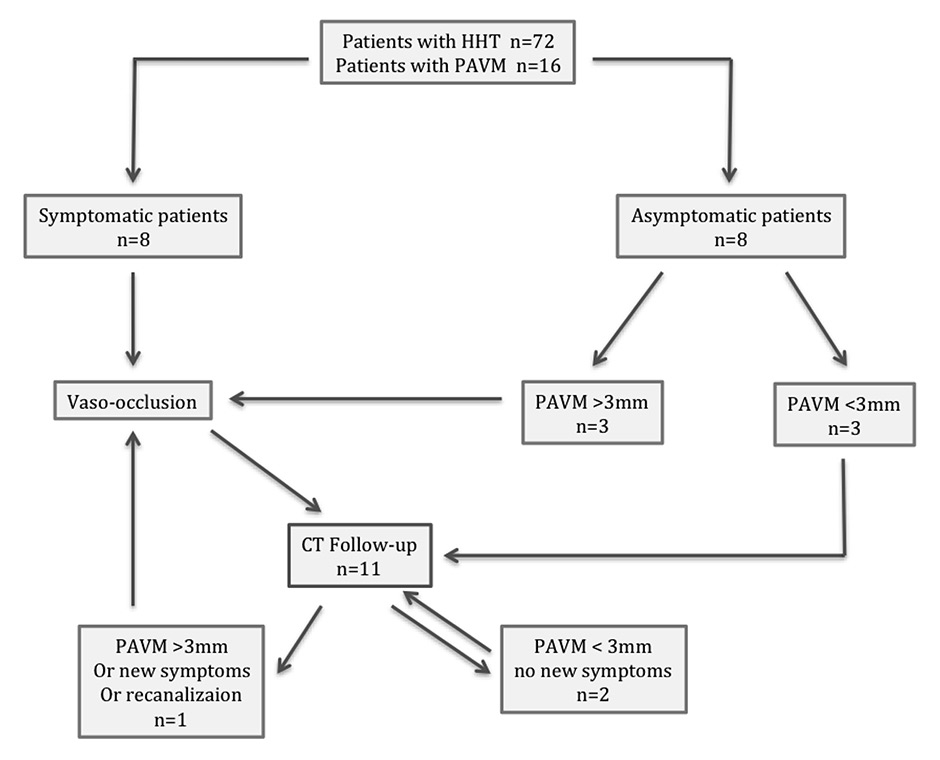 Treatment for symptomatic or >3 mm pulmonary arteriovenous malformations and follow-up.
