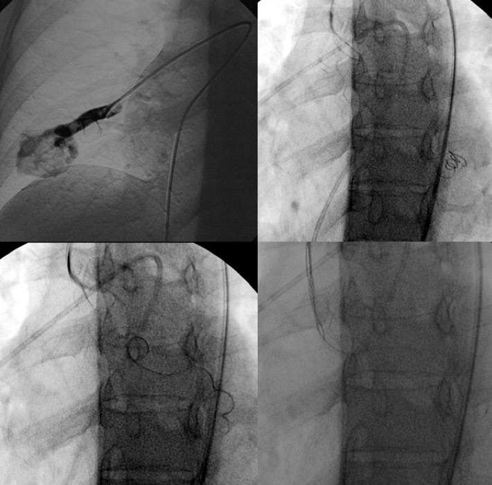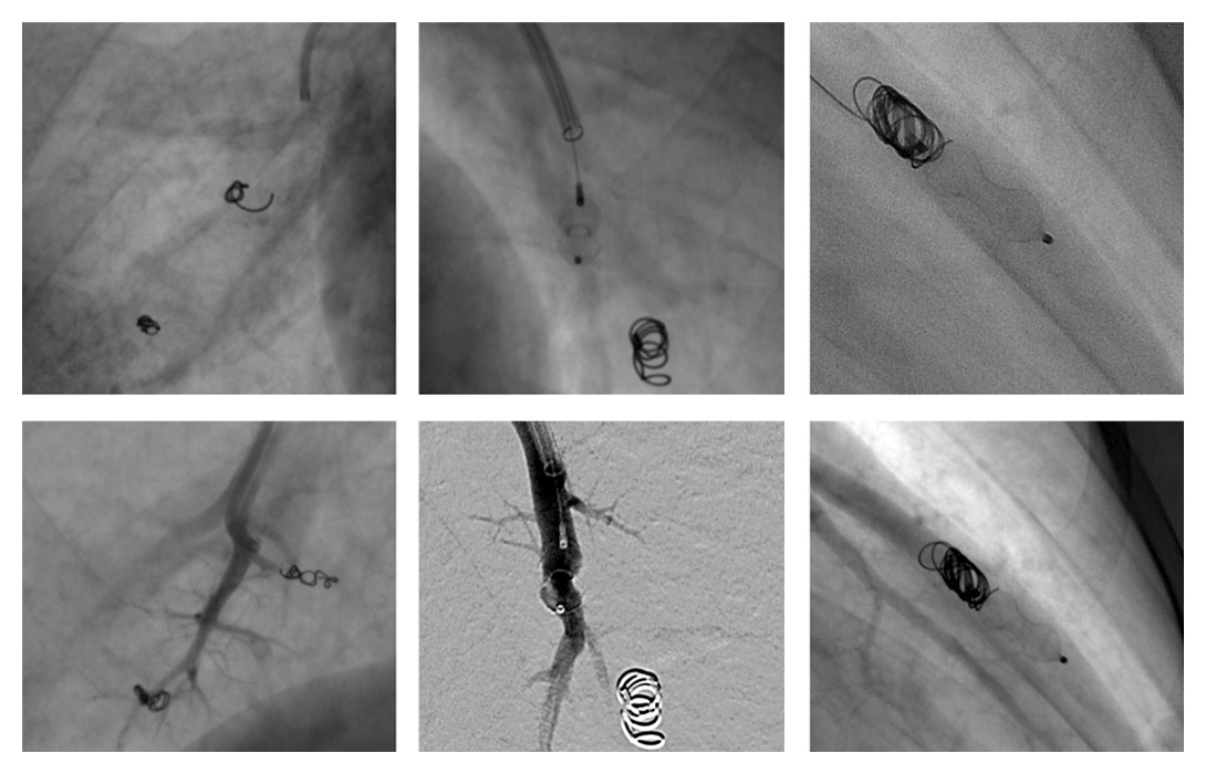 Examples of pulmonary arteriovenous malformation endovascular vaso-occlusions with vascular coils, plugs and combined treatment. Beneath each case is an angiographic control showing no vascular opacification beyond the occlusive device.