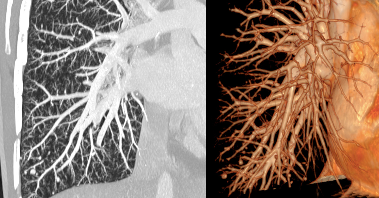Maximun intensity imaging and 3D reconstructions of pulmonary computed tomography angiography showing numerous pulmonary arteriovenous malformations in a female 50 years old female patient known to have hereditary haemorrhagic telangectasia.