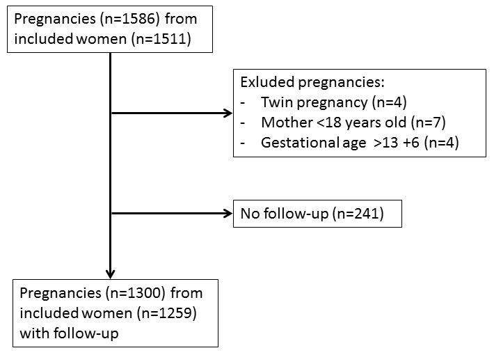 The study population consisted of 1,511 women. Sixty women had two pregnancies during the study period; therefore a total of 1,571 pregnancies were included in the study cohort. The women presented at median gestational week 12+3 (IQR 12+0, 12+6). The baseline characteristics of the study population are given in table 1. Follow-up data were available for 1,300 pregnancies resulting in a follow-up rate of 82.75%. It can be seen in table 1, that the women with and without follow-up exhibit significant (but clinically unimportant) differences only in BMI and the frequency of Asian descent. Four women were excluded because of a twin gestation, seven women were under 18 years old upon enrolment and four women provided the sample at a gestational age above 13+6 weeks. In order to minimise the influence of missing follow-up data and owing to the fact that no meaningful differences between women with and without follow-up could be detected, the analysis was confined to women with follow-up.