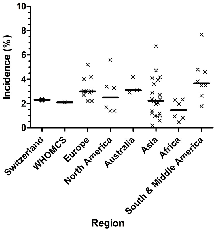 X denotes a point incidence observed at a specific period of time in a specific country. A bold horizontal line indicates the median of all observed incidences within a regional group. Data are taken from references [18, 26, 27, 33, 43–57] and are specified in more detail in table 3. Summary data from WHOMCS (World Health Organization Multicountry Survey on Maternal and Newborn Health) originate from reference [26].