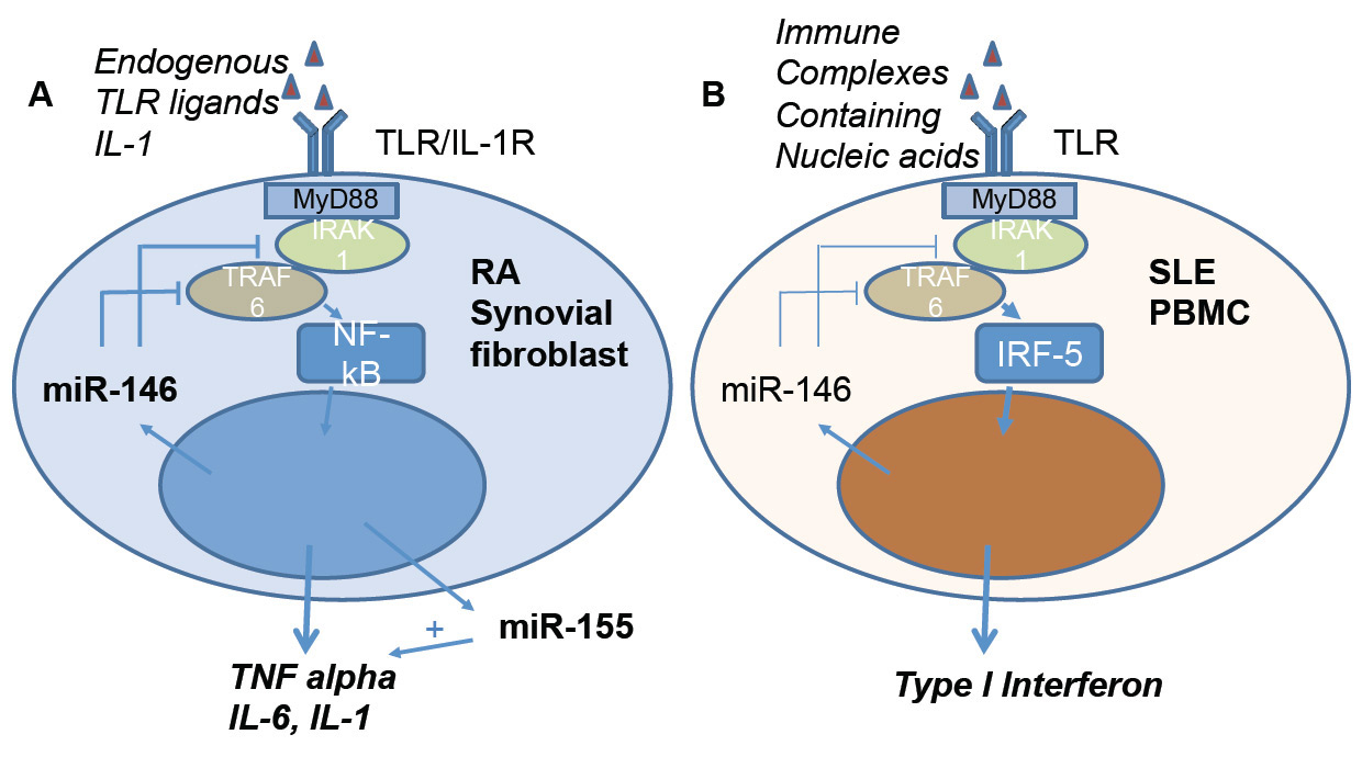 Regulatory role of miR-146 and miR-155 on inflammation in activated synovial fibroblasts of patients with rheumatoid arthritis (A) and on type I interferon production in PBMC of patients with SLE (B). (A) Activation of synovial fibroblasts by endogenous Toll-like receptor (TLR) ligands or interleukin 1 (IL-1) initiates a signalling cascade via nuclear factor kappa B (NF-κB) resulting in expression of proinflammatory cytokines, such as tumour necrosis factor alpha (TNF-α). Overexpression of TNF-α is a hallmark of rheumatoid arthritis. In activated synovial fibroblasts miR-155 expression is induced, further enhancing TNF-α production. In contrast, miR-146 has a modulatory role by inhibiting the signalling molecules interleukin 1 associated receptor kinase 1 (IRAK1) and TNF-receptor accessory factor 6 (TRAF 6). (B) Regulatory role of miR-146 in SLE PBMC. In contrast to the overexpression of miR-146 in RA, in SLE miR-146 levels are decreased, resulting in an increased activation of IRF-5 and expression of type 1 interferon.