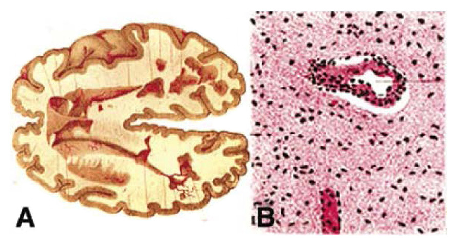A. Plaques embedded in brain white matter (Charcot 1880); B. perivascular and parenchymal inflammatory infiltrates (Babinski, 1885). (from H. Lassmann, Brain Pathol. 2005)