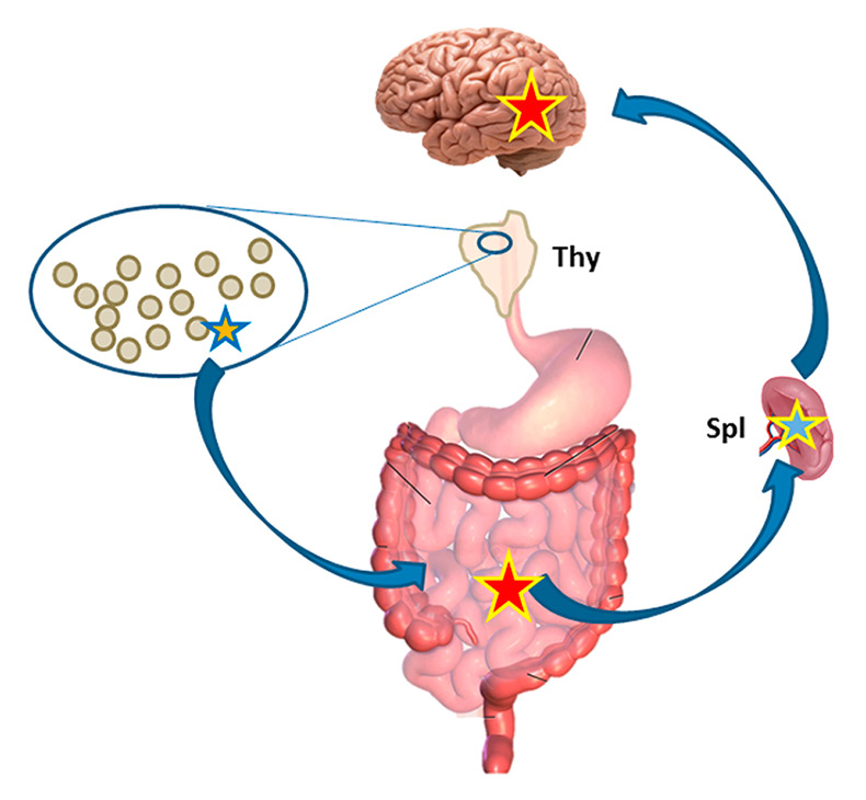 Autoimmune T cell migration. Dormant autoimmune T cell (blue/orange star) in natural thymus (Thy)-derived immune repertoire migrates to the intestinal tract, where it is activated (yellow/red). From there the cell travels through peripheral immune organs (lymph nodes, spleen, Spl), where it is tuned to migrate to the brain (yellow/blue) and ultimately penetrates into the brain parenchyma, where it is re-activated by confrontation with brain autoantigen (yellow/red).
