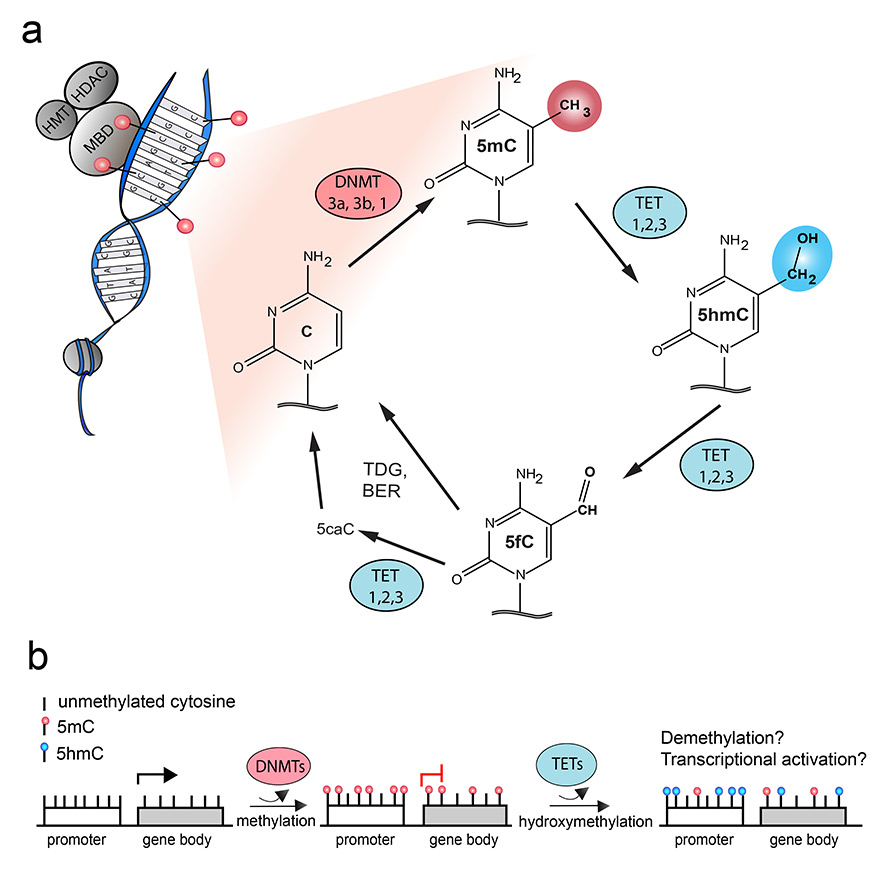 DNA methylation and hydroxymethylation.Cytosine modifications in DNA have functional consequences on gene expression. (a)Cytosine can be methylated by DNMT enzymes to give rise to 5mC, which can be oxidised by TET enzymes to 5hmC and further products (5fC and 5caC). In an active demethylation pathway, these products of TET enzymatic activity are likely to be excised and repaired by the thymine-DNA glycosylase enzyme and base excision repair mechanisms to regenerate the unmodified cytosine. Methylated DNA can be recognised by MBD proteins that can recruit histone modifying complexes (HMTs and HDACs). (b) DNA methylation occurs at regulatory regions (such as promoters), but also in gene bodies. DNMT enzymes are responsible for 5mC deposition, often resulting in the transcriptional repression of the methylated promoter. TET proteins activity can lead to demethylation with a potential for transcriptional activation.