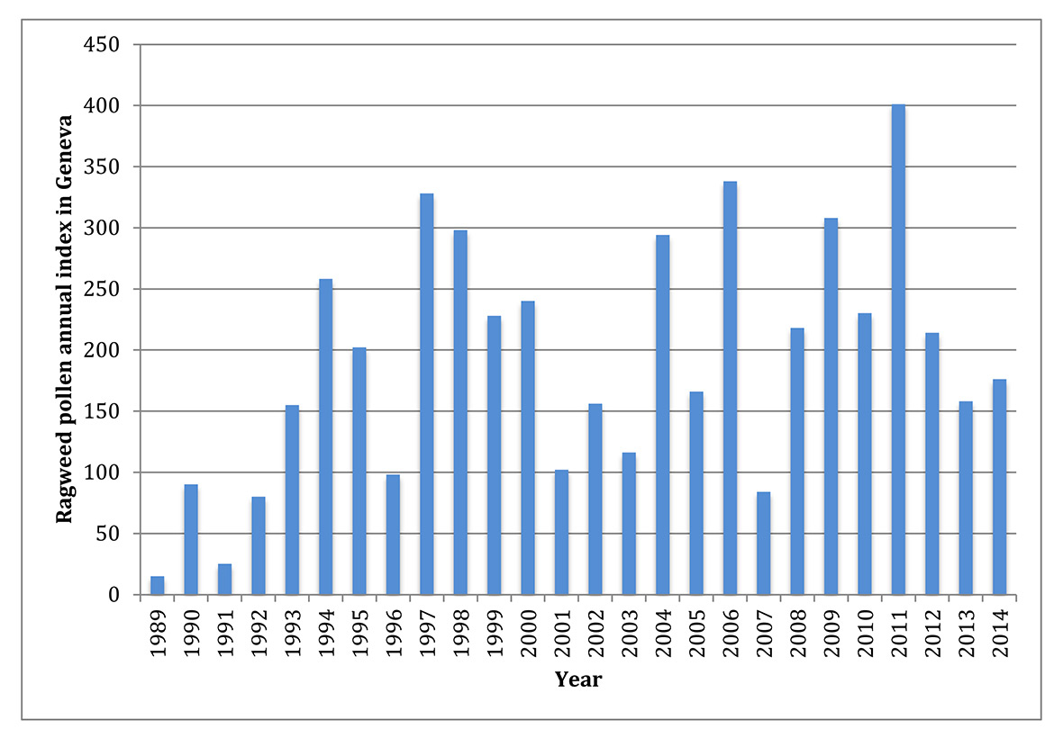 Ragweed annual pollen counts over 20 years in Geneva (source: MétéoSuisse).