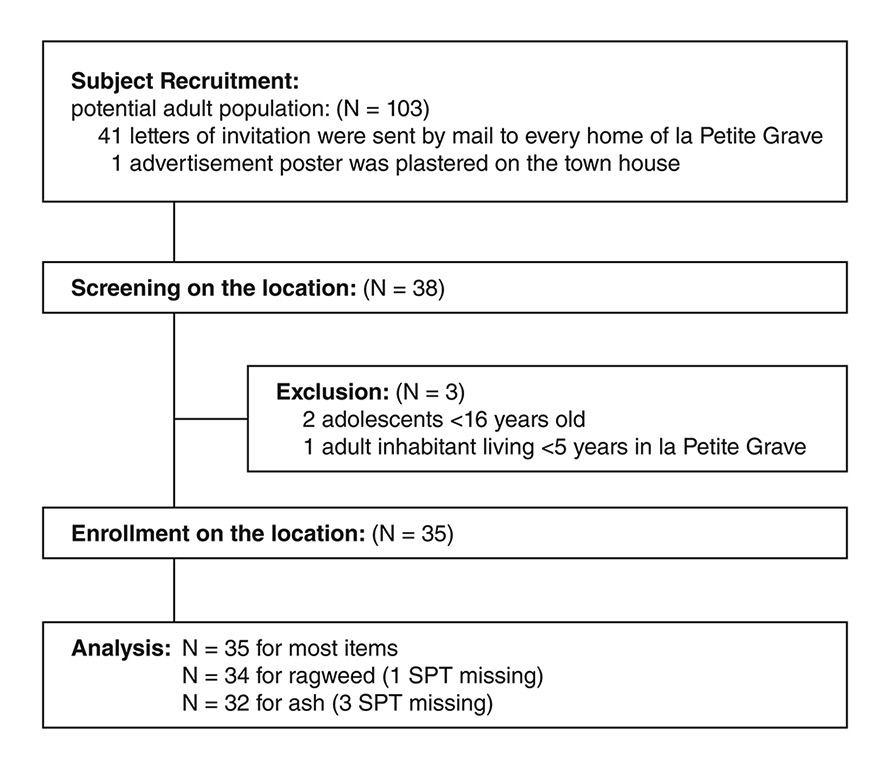 Data regarding age, gender, allergic and nonallergic rhinitis and asthma symptoms were collected by means of history-taking and on specific questionnaires such as the Allergic Rhinitis Questionnaire [11] and the Asthma Control Questionnaire [12]. We performed skin-prick tests (SPTs) with commercial, standardised extracts (ALK Abello, Wedel, Germany) [13] on every participant in order to detect sensitisation towards ragweed and common inhalant allergens such as: Betula pendula (birch), Corylus avellana (hazel), Alnus glutinosa (alder), Fraxinus excelsior (ash), grass mix, weed mix, Artemisia vulgaris (mugwort), house dust mite mix, cat and dog epithelia and mould mix. One SPT for ragweed was left out, thus changing n from 35 to 34, and three SPTs failed for ash, therefore changing n from 35 to 32 (fig. 2). All other sensitisation rates were calculated with n = 35. SPTs were performed on the flexor forearm with a standardised prick needle. Histamine dihydrochloride (10 mg/ml) was used as a positive control, and the glycerol-containing diluent was used as a negative control. Reactions were recorded after 15 minutes. Wheals with a diameter of at least 3 mm in the presence of a negative control were considered positive. All subjects consented and the study was approved by the Ethics Board for Research of the Department of Internal Medicine and Community Medicine, at the University Hospital of Geneva on 2 June 2009. The 95% confidence intervals of the proportion were assessed with the exact method of Clopper-Pearson. Statistics were calculated with the Microsoft Excel software.