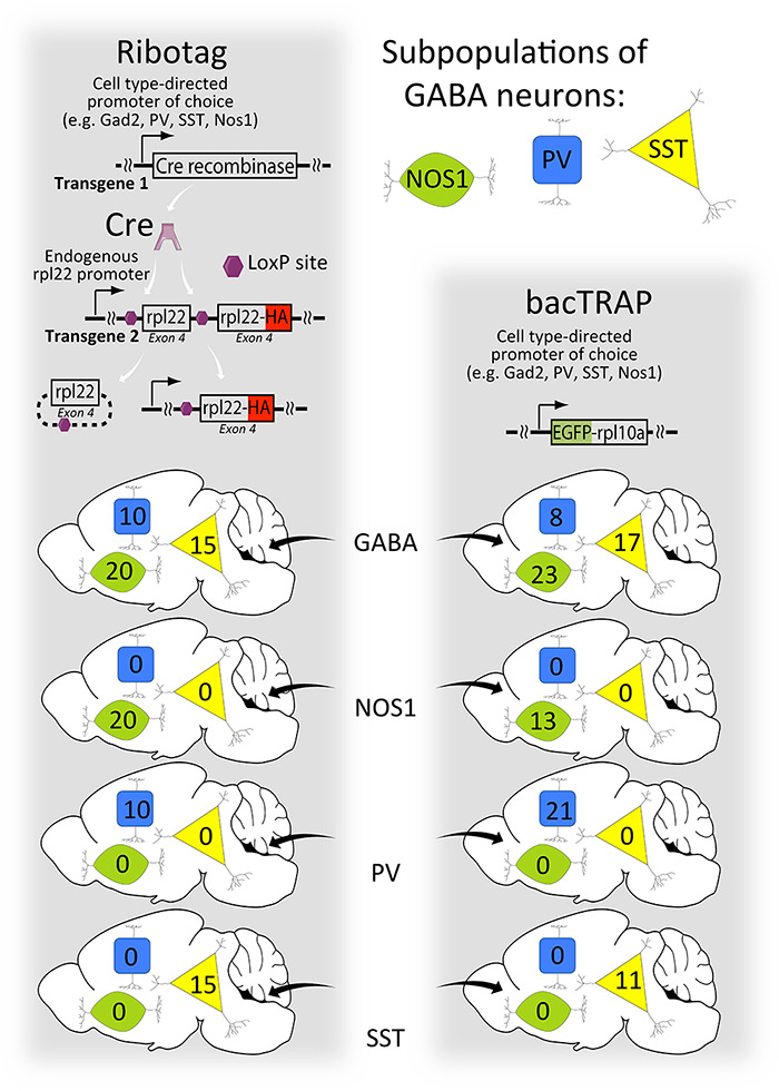 A comparison of Ribotag and bacTRAP methods. In the left pathway, a ubiquitous promoter drives expression of the Ribotag (rpl22-HA) protein only after Cre recombinase activity releases the inhibition of Ribotag expression. The endogenous rpl22 exon 4 functions as a ‘floxed STOP’ for the Ribotag method, as shown in fig. 4. The cell type specificity is determined by the pattern of Cre expression. Therefore, the same cell targeted by different Cre activators will have the same expression level of the Ribotag protein because the same ubiquitous promoter drives its expression from the same place in the genome. In contrast (right pathway), different promoters drive the expression of bacTRAP resulting in different expression levels in this hypothetical example. An important advantage of bacTRAP is that one mouse line is needed versus two for Ribotag.