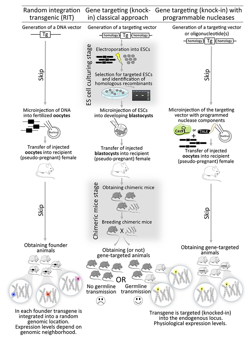 A comparison of strategies to genetically engineer mice. The random integration approach (left workflow) is useful for adding new genes, and is technically straightforward, but suffers from position effects (transgenes on different chromosomes on the bottom). The gene targeting approach (middle workflow) is more laborious, requiring embryonic stem cell (ESC) culturing, and breeding of chimeras, which often fail to transmit the transgene to their progeny. The breakthrough of the gene targeting approach employing guided nucleases (right workflow), is that the final result of gene-targeted mice is obtained without the ESC culturing and chimera breeding hassles.