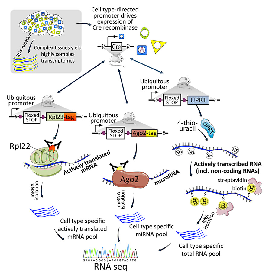 Transgenic techniques for cell type-specific RNA capture. A mouse expressing Cre recombinase is bred with a mouse encoding transgenes for RNA capture components. Each transgene is activated by Cre to drive cell type-specificity. The Rpl22 (ribosomal protein L22) protein captures ribosomes and ribosome-bound mRNAs during translation (the Ribotag method). The Ago2 protein captures the RISC complex and associated miRNAs. The UPRT enzyme converts 4-thiouracil into a nucleotide that is incorporated into newly transcribed RNA.