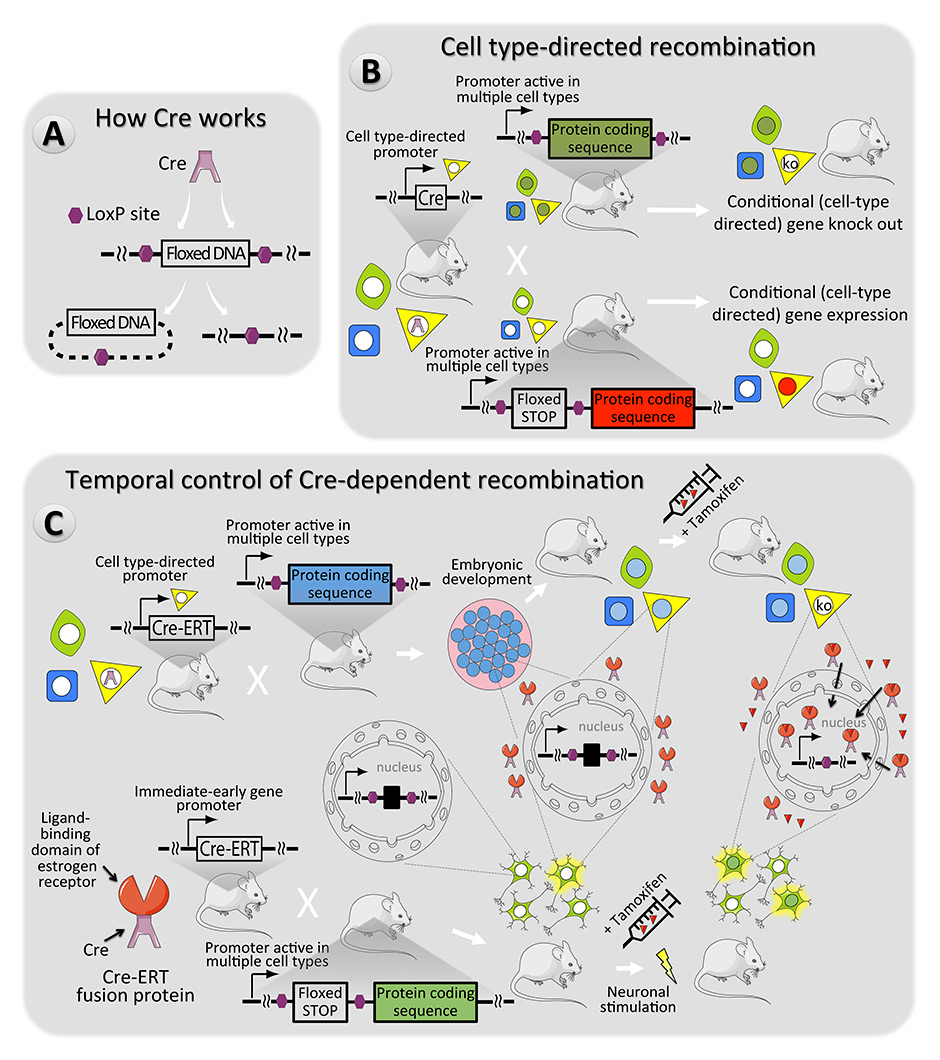 Cre recombinase – a versatile mouse genome manipulation tool. (A) In the systems described here, the activity of the Cre enzyme results in the removal of DNA sequences between two LoxP sites in the mouse genome [160]. (B) Spatially restricted expression of Cre can be employed to inactivate or activate genes in specific cell types [146] (cell type 3 – yellow). (C) Temporal control of Cre activity can be accomplished with fusion proteins consisting of Cre with an oestrogen receptor fragment (ERT) which prevents Cre-mediated recombination, until tamoxifen is present to direct the Cre-ERT fusion into the nucleus [161]. The top pathway features an example where the promoter driving Cre-ERT is cell type-specific. This is convenient in cases where cellular phenotypes change during development or through time (e.g. neural precursor cells can become neurons or glia). The bottom pathway features an example where Cre-ERT expression is induced by stimuli that happen often but when Cre activity is desired for a specific time. In this example an immediate early gene promoter drives expression, which would happen often, but Cre activity would occur only when tamoxifen is present [149].