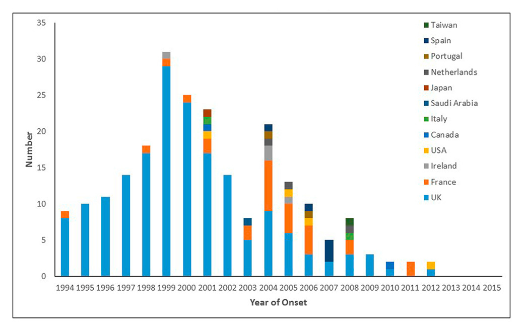 Variant Creutzfeldt Jakob disease cases by year and country: 1994‑2015 (n = 229).
