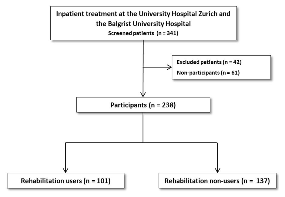 Flowchart of study participants vs nonparticipants, rehabilitation users vs rehabilitation nonusers.