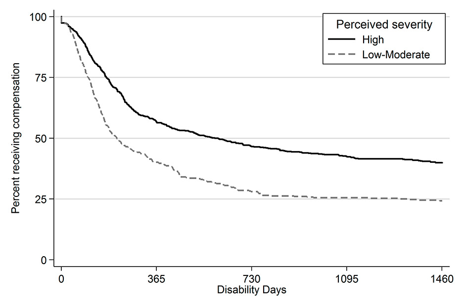 Furthermore, these data allow us to understand better the kinetics of TFW. The slope of the survival curve decreases progressively, eventually reaching a final plateau 2 years after rehabilitation (see fig. 1). This means that about one third of the patients are likely to experience long or even permanent disability. Interestingly, patients who perceived a lower severity of their injuries were more rapidly fit for work (half of them did not get compensation after 194 days, see fig. 3) than those with a high perceived severity (half of them were getting compensation for at least 602 days).