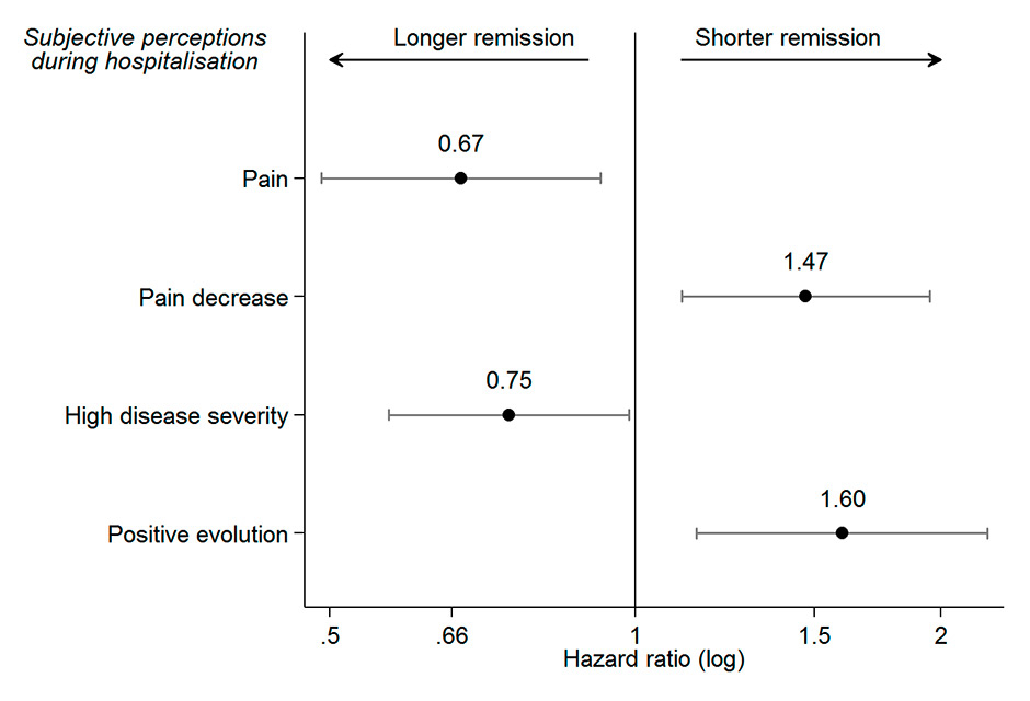 We repeated the same model selection procedure with the subsample for whom AIS score was available. We first screened all potential predictors one by one, adjusting for the confounders and for AIS (see appendix, supplementary table S1). All variables with p ≤0.10 were included in the full model and the backward selection procedure led to a final model that contains four independent predictors: pain at admission, pain evolution during hospitalisation, perceived severity and expected disease evolution (supplementary table S1 and supplementary fig. S1). These predictors were the same as those obtained with the full data. Because of the smaller sample size (n = 364), the confidence intervals were wider, but all predictors remained significantly associated with TFW except global health. Moreover, hazard ratios were very close to those obtained with the full data.