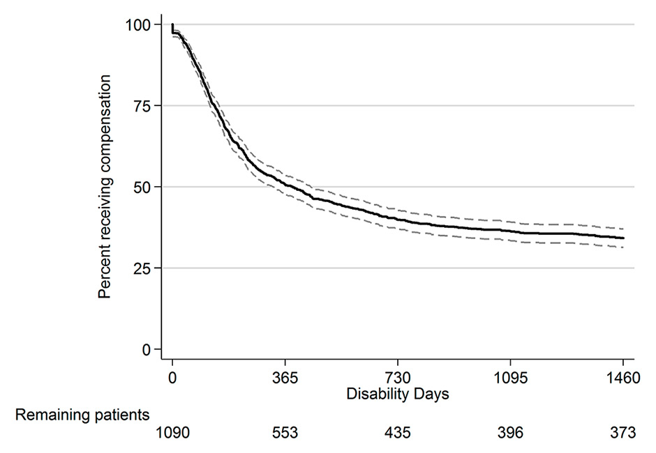 Median time on wage compensation over 4 years for the 1 090 enrolled patients was 389.0 days (Kaplan-Meier estimation; 95% CI 327.5–447). Figure 1 shows the Kaplan-Meier survival function for TFW. We saw a sharp decrease during the first year, with about half of the patients being declared fit for work, and then a flattening of the curve to an extended plateau, mainly after 2 years of compensation. This means that people who were still unable to work 2 years after their rehabilitation stay are very likely to remain disabled, obtaining a permanent disability pension.
