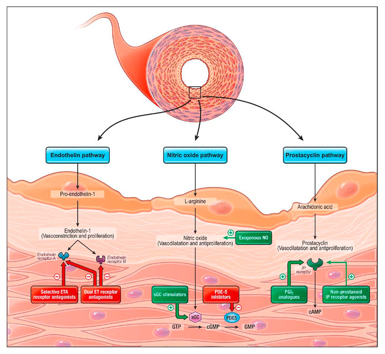 ET-1 is the most potent vasoconstrictor synthesised in the human body and induces smooth muscle cell proliferation through the binding of endothelin receptors A and B (ETA/ETB) [21, 22]. In PAH, ET-1 biosynthesis is up-regulated, as demonstrated by both higher serum levels and increased ET-1 staining in the pulmonary arteries of lung specimens taken after transplantation [23]. On the side of vasodilators, NO bioavailability is reduced by numerous mechanisms in PAH, and soluble guanylate cyclase (sGC), which generates cyclic guanosine monophosphate (cGMP) in smooth muscles cells in response to NO, is partially inactivated because of high levels of oxidative stress [24]. Furthermore, phosphodiesterase type 5 (PDE-5) has been found to be upregulated in lung homogenates of patients with PAH, leading to quicker inactivation of cGMP [25]. Finally, PGI2 expression is also severely reduced in PAH [26], and to a lesser level its specific IP receptor in the smooth muscle cells of pulmonary arteries [27].
