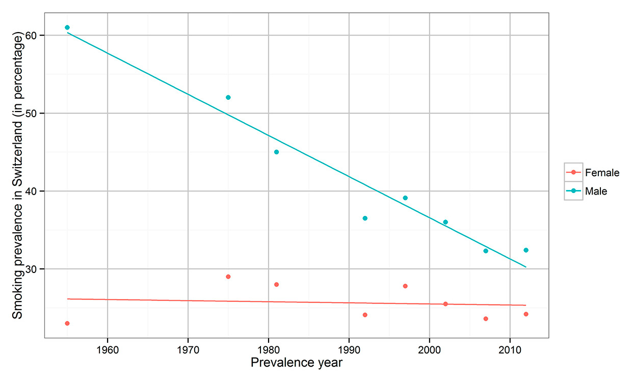 Smoking prevalence in Switzerland, 1955–2012. Source: 1955 [14], 1975–1981 [15], 1992–2012 [16].