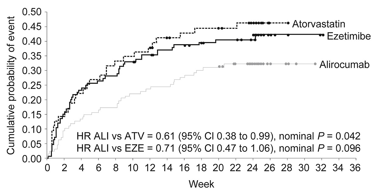 ALI = alirocumab; ATV =atorvastatin; CI = confidence interval; EZE = ezetimibe; HR = hazard ratio.