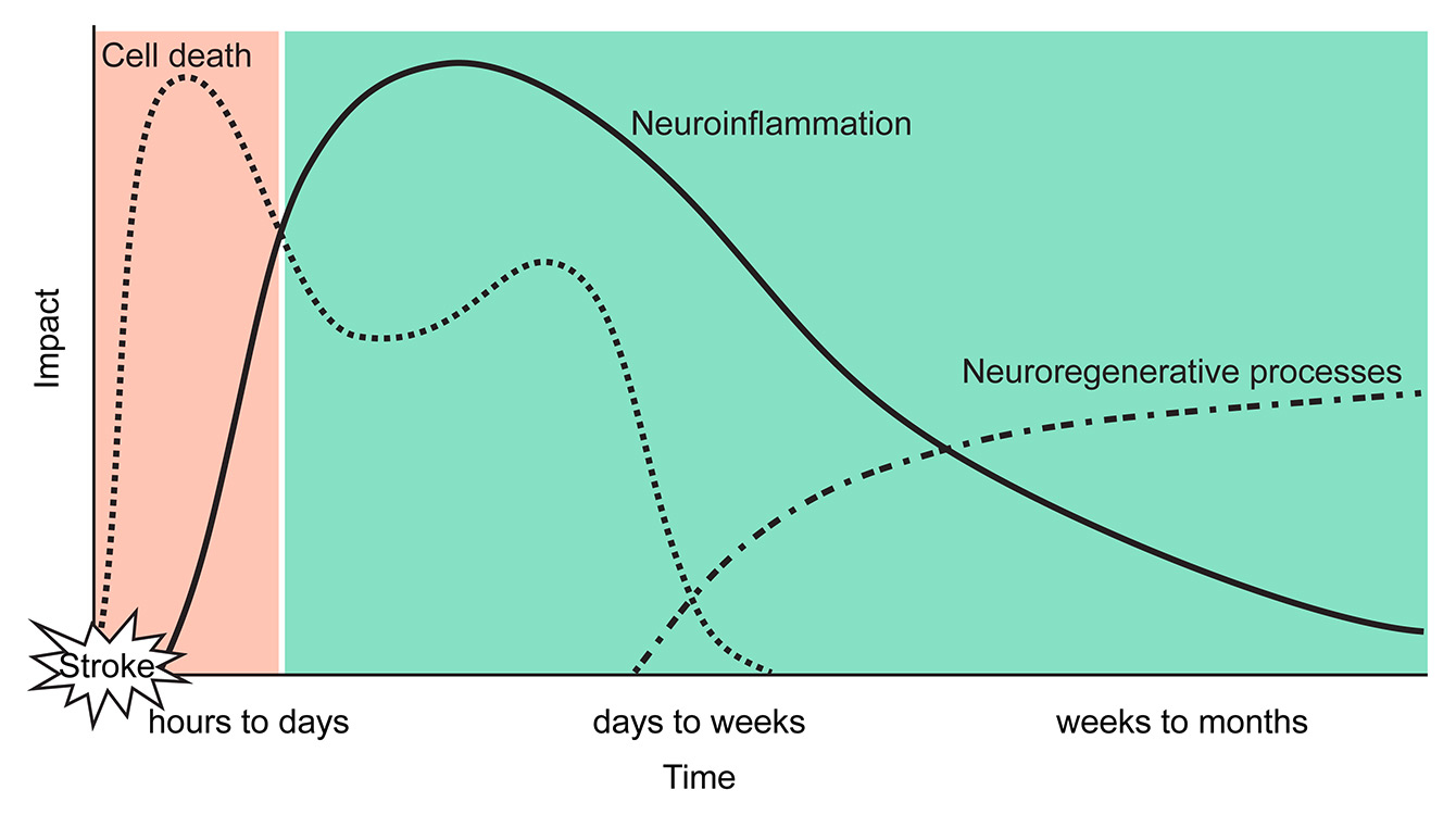 Previous neuroprotective strategies targeted pathological mechanisms in a very narrow window of opportunity in the (hyper-) acute phase after stroke (orange). Recently, the focus of translational stroke research has shifted towards understanding pathological processes in the subacute and chronic phase such as neuroinflammation and neuroregeneration (green). These targets have the potential for novel therapeutic approaches which are suitable for a larger population of stroke patients then neuroprotective agents or thrombolysis.