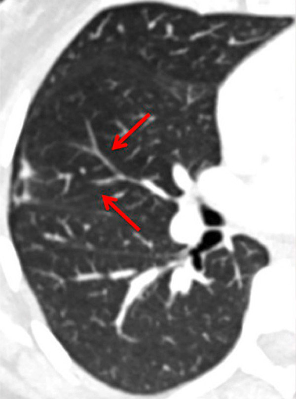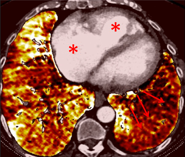 Severe bronchopathy (arrow) in the left lower lobe (A) associated with extended hypoperfusion (arrow) and dilatation of the right cardiac cavities (stars) (B).
