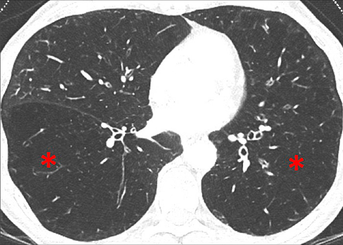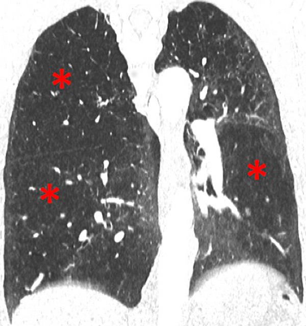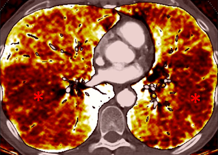Chronic obstructive pulmonary disease. Correlation between panlobular emphysema (A/B) and pulmonary hypoperfusion (C/D) (stars).