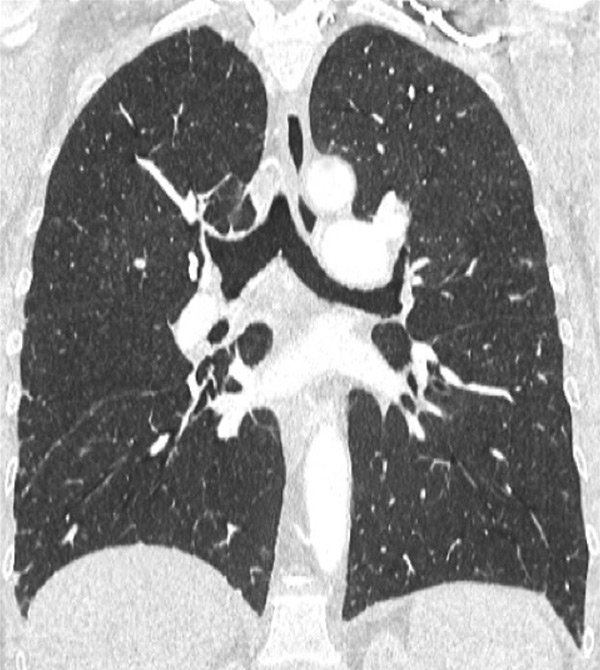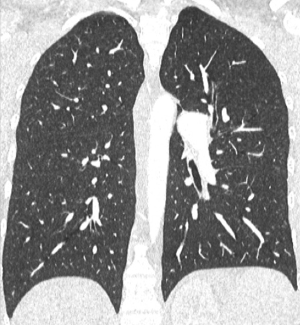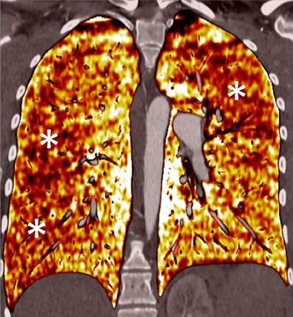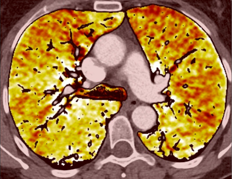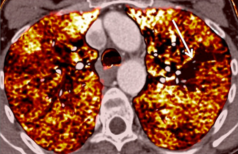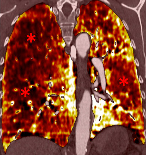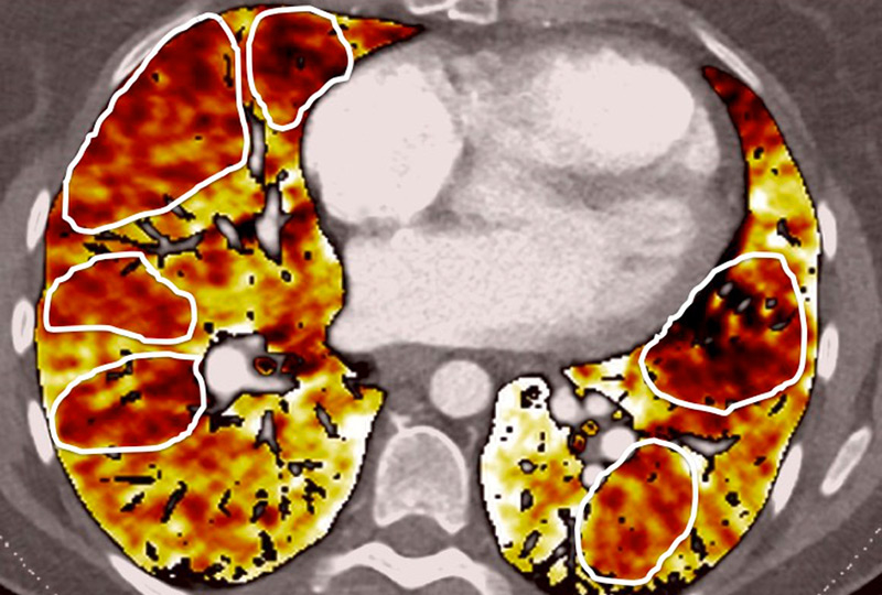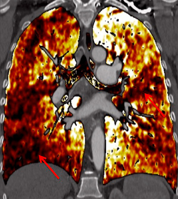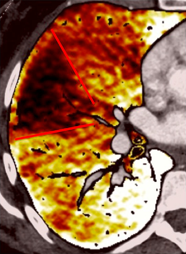 DECT simultaneously provides an assessment of the perfusion status of the lungs and parenchymal images in a single acquisition. Because of this simultaneous study of the perfusion maps with conventional parenchymal images, the severity of pulmonary hypoperfusion can be determined. Perfusion abnormalities may be caused by parenchymal destruction as in interstitial lung disease, bronchopathy or pulmonary emphysema, and it is mandatory to analyse the iodine maps with the lung reconstructions before deciding on the origin of perfusion defects. Perfusion defects may match areas of parenchymal destruction. For example, perfusion defects in areas of bronchopathy suggest hypoperfusion due to airways disease secondary to pulmonary artery vasoconstriction (fig. 10).