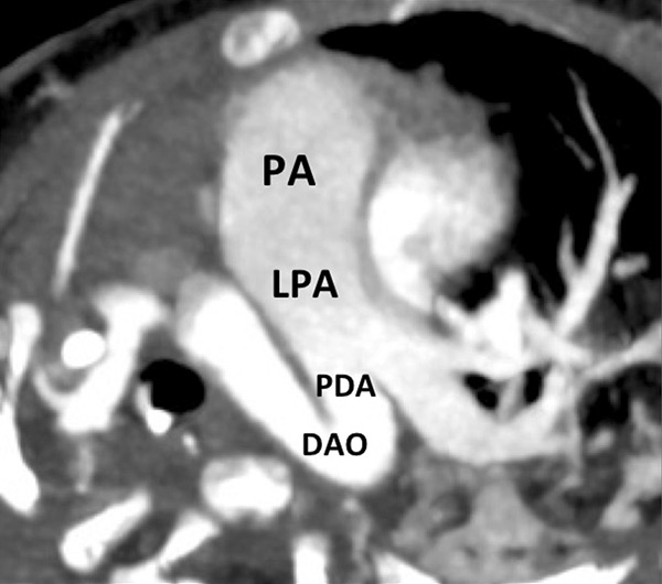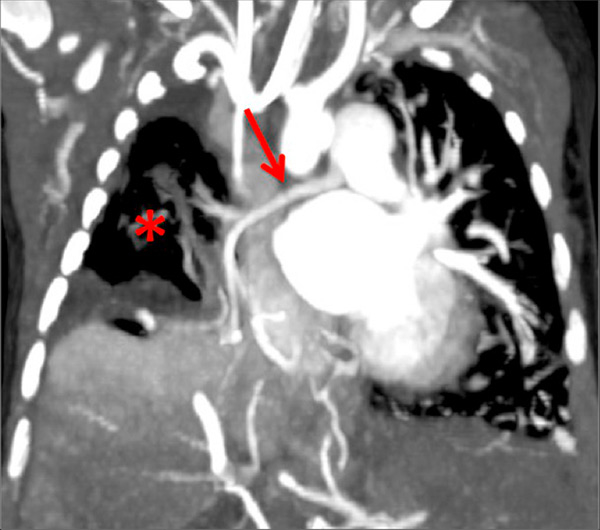 Pulmonary hypertension due to a patent ductus arteriosus (PDA) connecting the descending aorta (DAO) to the left pulmonary artery (LPA) (A) in a 2-month-old boy treated for a right diaphragmatic hernia (B) resulting in hypoplasia of the right pulmonary artery (arrow). The functional consequences (C) are extended hypoperfusion of the right lung (star).