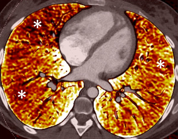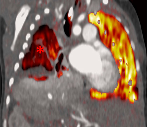 Portopulmonary hypertension in a 16-year-old. No abnormalities were found on morphological computed tomography (A/B), but heterogeneous perfusions were present on the perfusion map (stars, C/D).