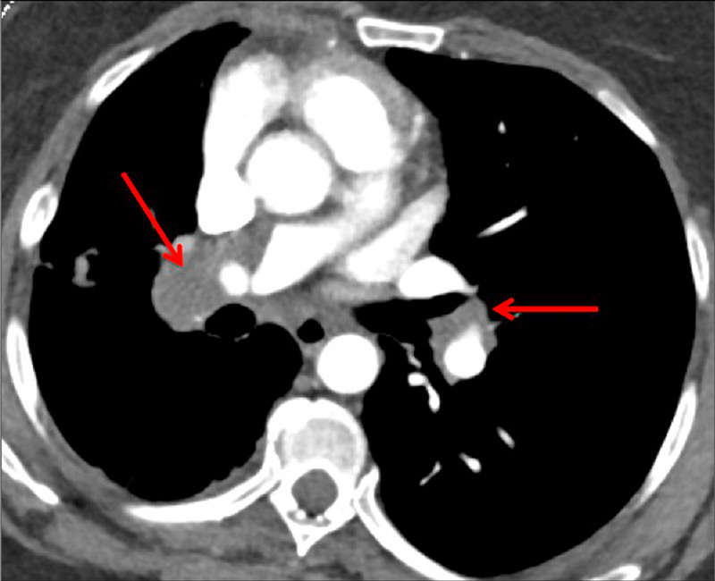 Peripheral chronic thromboembolic pulmonary hypertension (CTEPH). No visible pulmonary artery emboli on standard CTPA are seen (arrows) (A) but a wide perfusion defect on the perfusion maps is depicted (B) and allows the diagnosis of peripheral CTEPH.