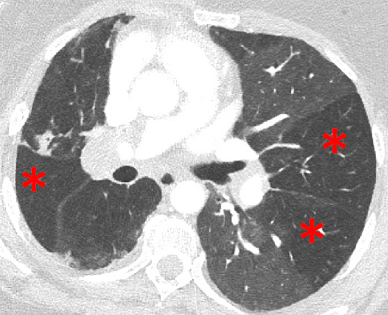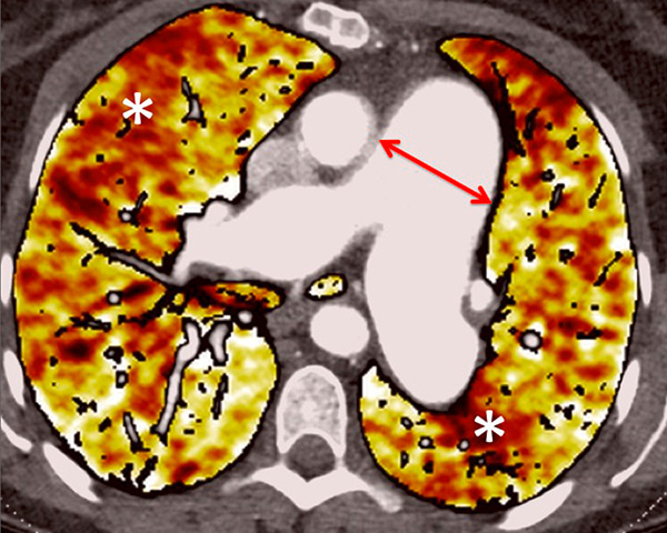 Perfusion heterogeneities in idiopathic pulmonary artery hypertension (stars) in two different patients (A/B). The dilatation of the arteries in pulmonary hypertension (arrows) is not always observed depending on the severity of pulmonary hypertension.