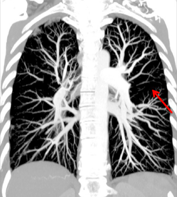 Eisenmenger’s syndrome secondary to a large ventricular septal defect. No vascular abnormalities were seen (A) but some ground-glass opacities (arrow) (B) with the absence of perfusion corresponded to vascular ground-glass opacities surrounded by clear heterogeneous pulmonary perfusion (C).