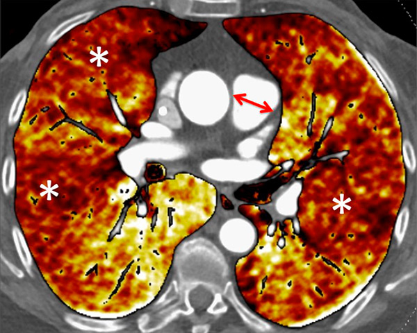 Conventional computed tomography (CT) of the chest may be helpful in diagnosing PH and determining underlying pathologies such as pulmonary or vascular abnormalities. Furthermore, functional information can then be added to CT by the use of a dual-energy protocol. As a consequence, new and noninvasive tools that might increase diagnostic accuracy and functional imaging [7–11] are being developed. Magnetic resonance imaging offers functional quantification but suffers from a lack of resolution of lung parenchyma and pulmonary arteries [12].