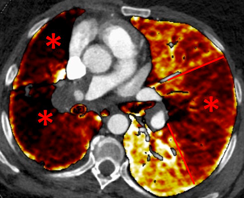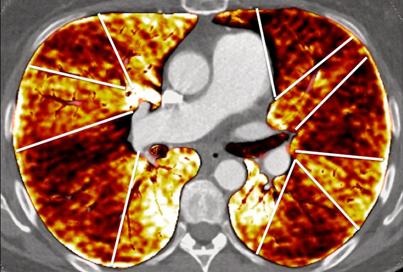 | Perfusion analysis | No perfusion analysis | Gold standard for perfusion analysis: Well-defined segmental perfusion defects Or a “mottled” pattern | Iodine maps correlated with scintigraphy: Well-defined segmental perfusion defects Or a “mottled” pattern With regional analysis |