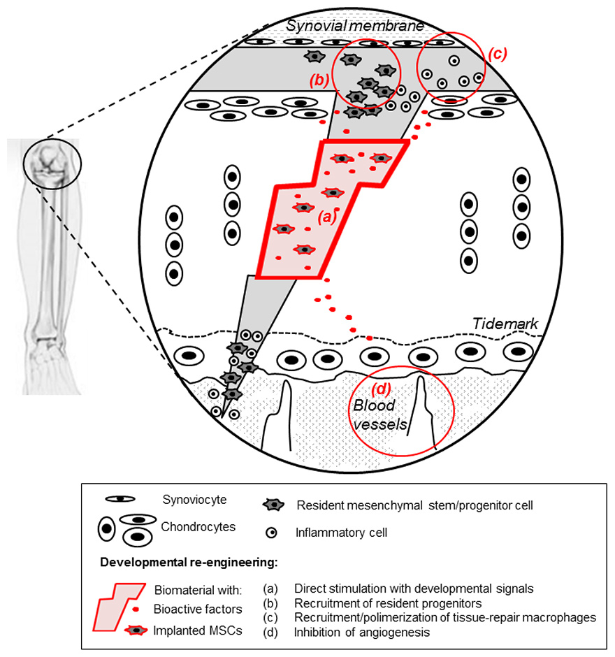 Developmental re-engineering strategy for cartilage repair. We envision the implantation of a graft fitting the site of the injury and able to integrate and release in a spatiotemporally controlled manner either one or several bioactive factors among: (a) developmentally inspired signals to guide either implanted or (b) resident progenitor cells towards a chondrogenic phenotype, (c) factors for the recruitment and polarisation of tissue-repair macrophages or (d) anti-angiogenic factors.