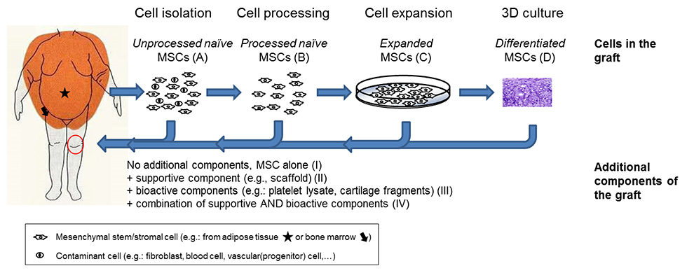 Classification of mesenchymal stromal/stem cell (MSC)-based strategies based on the type and differentiation stage of cells (capital letters in parenthesis) and additional components (Roman numbers in parenthesis) present in the graft. Below are listed examples of MSC-based graft material used in selected clinical trials registered at http://clinicaltrials.gov (keywords used for the research: stem cells AND cartilage repair).