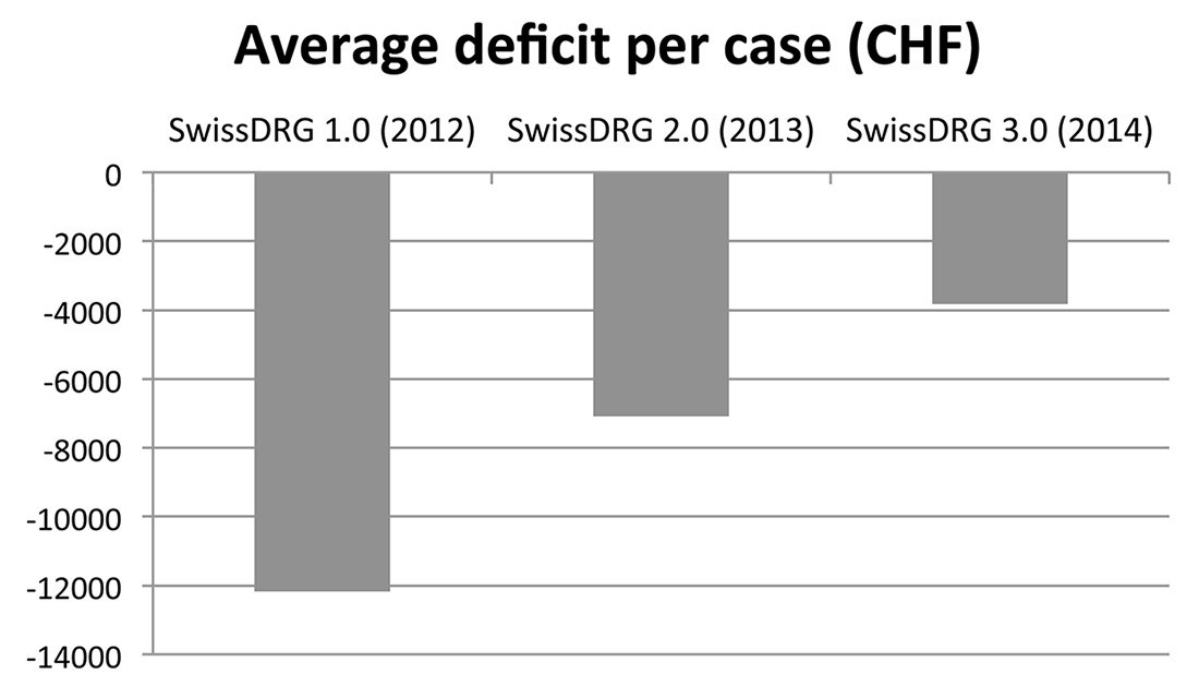 The average per-case deficit substantially dropped from 12 065 CHF under SwissDRG catalogue 1.0 to 2902 CHF under catalogue version 3.0 (table 3).